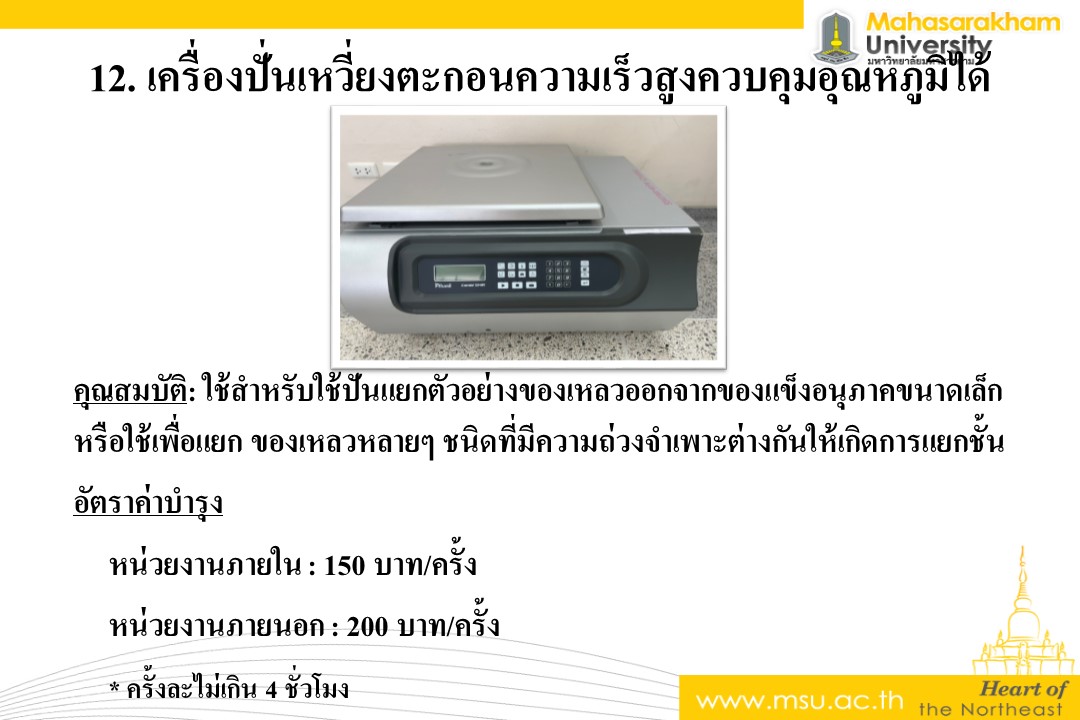 คุณสมบัติ: ใช้สำหรับใช้ปั่นแยกตัวอย่างของเหลวออกจากของแข็งอนุภาคขนาดเล็กหรือใช้เพื่อแยก ของเหลวหลายๆ ชนิดที่มีความถ่วงจำเพาะต่างกันให้เกิดการแยกชั้น อัตราค่าบำรุง หน่วยงานภายใน : 150 บาท/ครั้ง หน่วยงานภายนอก : 200 บาท/ครั้ง * ครั้งละไม่เกิน 4 ชั่วโมง