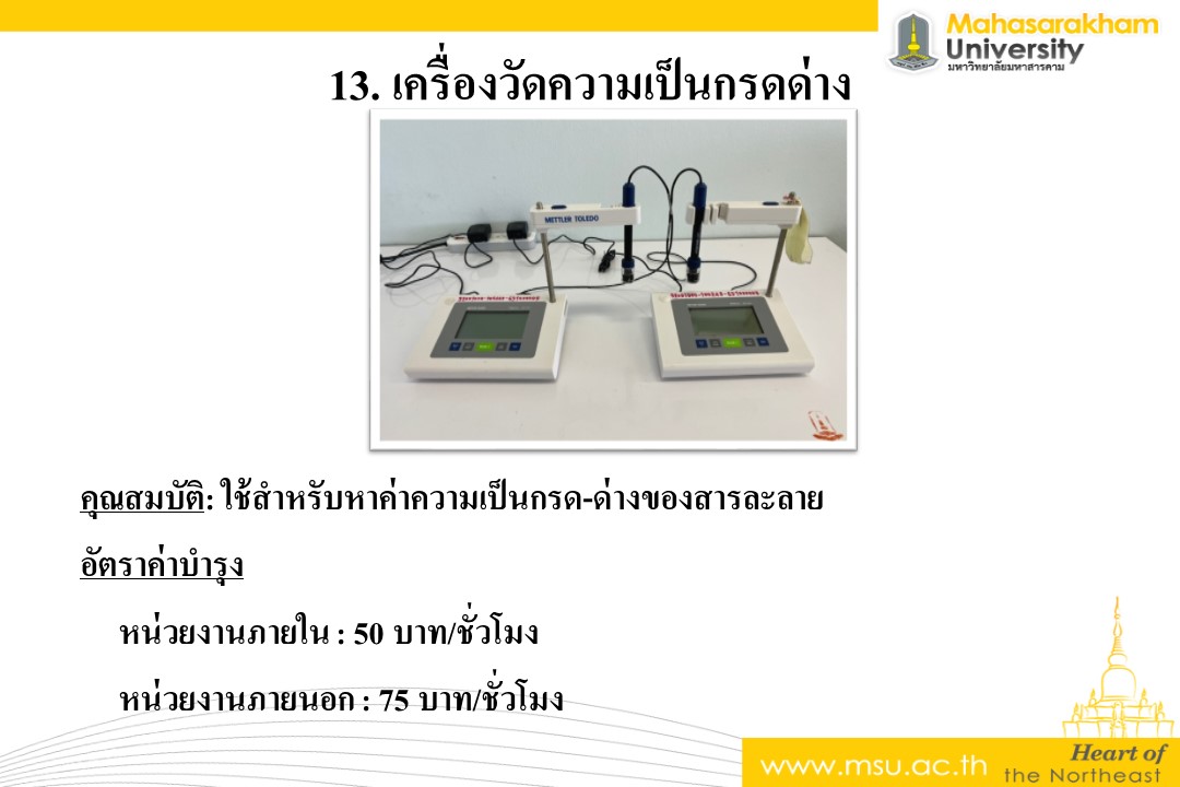 คุณสมบัติ: ใช้สำหรับหาค่าความเป็นกรด-ด่างของสารละลาย อัตราค่าบำรุง หน่วยงานภายใน : 50 บาท/ชั่วโมง หน่วยงานภายนอก : 75 บาท/ชั่วโมง