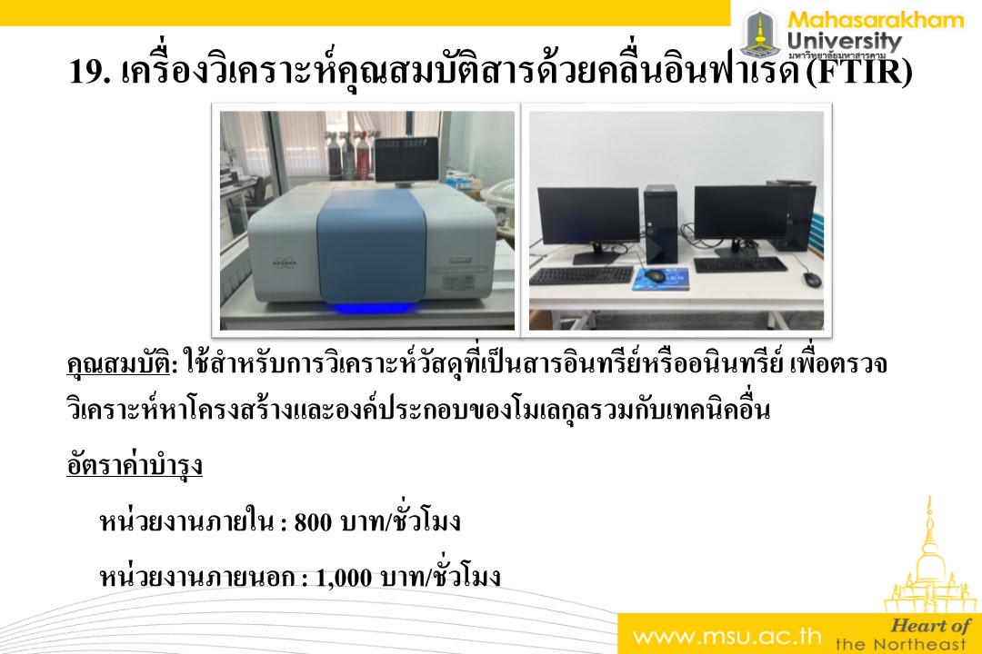 คุณสมบัติ: ใช้สำหรับการวิเคราะห์วัสดุที่เป็นสารอินทรีย์หรืออนินทรีย์ เพื่อตรวจวิเคราะห์หาโครงสร้างและองค์ประกอบของโมเลกุลรวมกับเทคนิคอื่น อัตราค่าบำรุง หน่วยงานภายใน : 800 บาท/ชั่วโมง หน่วยงานภายนอก : 1,000 บาท/ชั่วโมง