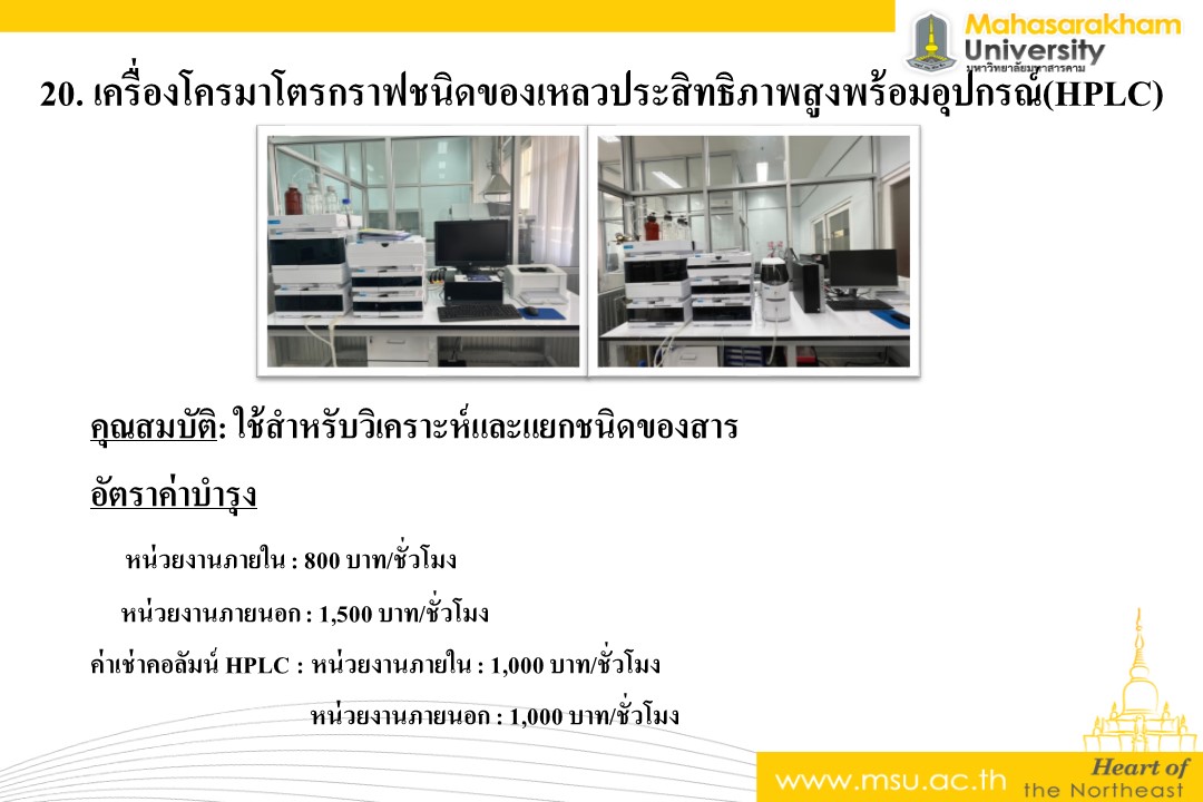 คุณสมบัติ: ใช้สำหรับวิเคราะห์และแยกชนิดของสาร อัตราค่าบำรุง หน่วยงานภายใน : 800 บาท/ชั่วโมง หน่วยงานภายนอก : 1,500 บาท/ชั่วโมง ค่าเช่าคอลัมน์ HPLC : หน่วยงานภายใน : 1,000 บาท/ชั่วโมง หน่วยงานภายนอก : 1,000 บาท/ชั่วโมง