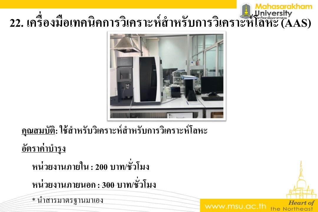 คุณสมบัติ: ใช้สำหรับวิเคราะห์สำหรับการวิเคราะห์โลหะ อัตราค่าบำรุง หน่วยงานภายใน : 200 บาท/ชั่วโมง หน่วยงานภายนอก : 300 บาท/ชั่วโมง * นำสารมาตรฐานมาเอง
