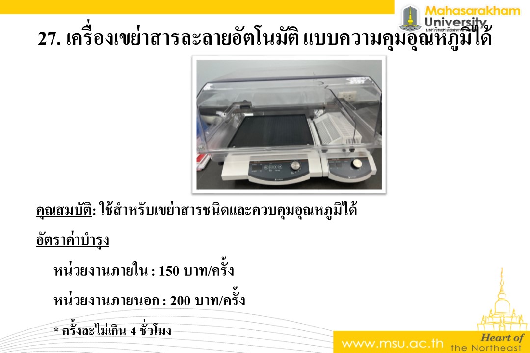คุณสมบัติ: ใช้สำหรับเขย่าสารชนิดและควบคุมอุณหภูมิได้ อัตราค่าบำรุง หน่วยงานภายใน : 150 บาท/ครั้ง หน่วยงานภายนอก : 200 บาท/ครั้ง * ครั้งละไม่เกิน 4 ชั่วโมง