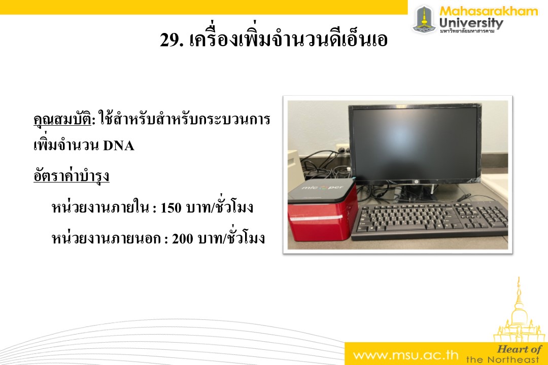 คุณสมบัติ: ใช้สำหรับสำหรับกระบวนการเพิ่มจำนวน DNA อัตราค่าบำรุง หน่วยงานภายใน : 150 บาท/ชั่วโมง หน่วยงานภายนอก : 200 บาท/ชั่วโมง