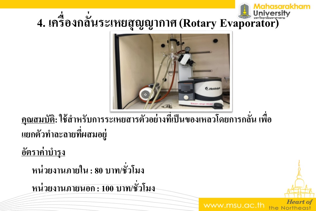 คุณสมบัติ: ใช้สำหรับการระเหยสารตัวอย่างที่เป็นของเหลวโดยการกลั่น เพื่อแยกตัวทำละลายที่ผสมอยู่ อัตราค่าบำรุง หน่วยงานภายใน : 80 บาท/ชั่วโมง หน่วยงานภายนอก : 100 บาท/ชั่วโมง